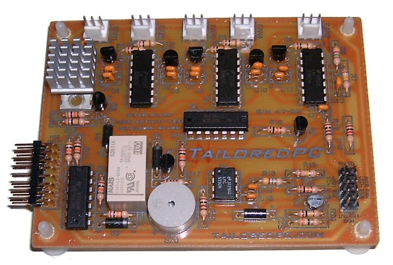 This is a control board for a water cooling system similar to the one above, but more simplified. Rather than hibernate the system, it simply shuts it down. As with the control board above, it also: